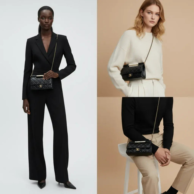 The Lumière Pearl 25 Bag Chanel is a true jewel in the form of an accessory — where golden metal meets the delicate allure of pearls in perfect harmony of sophistication and style.Inspired by the elegance of haute couture, this piece is crafted from premium genuine leather, featuring gold-tone hardware and a pearl-detailed handle that exudes timeless luxury. Its structured silhouette and smart interior design blend elegance and practicality, making it the perfect companion for evenings out, special occasions, or moments of everyday glamour.The Lumière Pearl 25 radiates femininity, confidence, and grace — a bag made for women who shine effortlessly. Dimensions: 25 × 17.5 × 7 cm