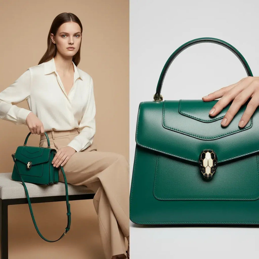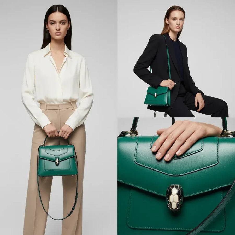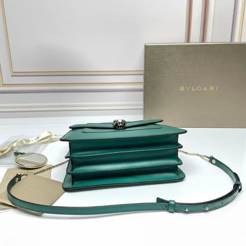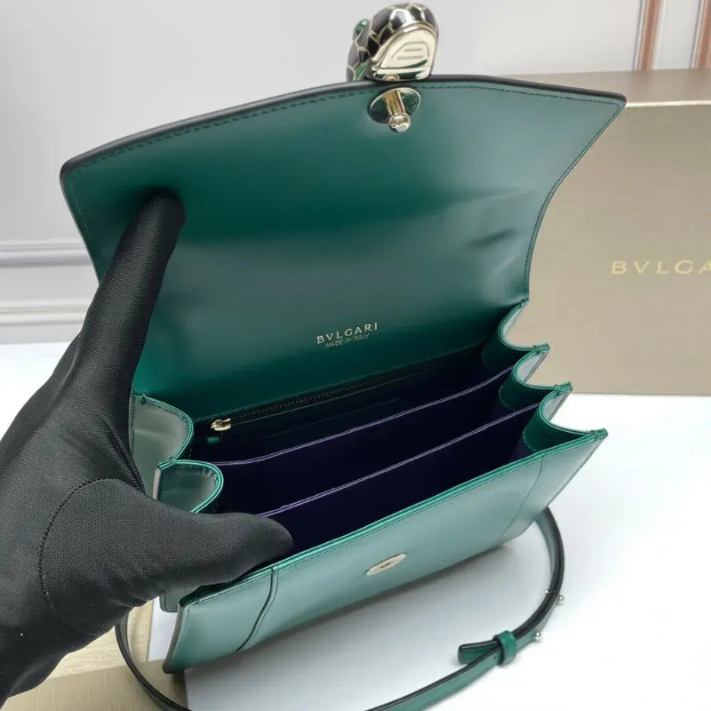 The Serpentia Noir Charm Bag Bvlgari merges timeless elegance with modern allure in a truly captivating design. Crafted from premium calfskin leather, it features a refined structure and impeccable craftsmanship that embody sophistication and confidence.Its iconic black-and-white enamel clasp, highlighted by malachite-green eyes, strikes the perfect balance between artistry and luxury. The smooth lines and subtle gold-plated accents enhance its seductive, refined character.Designed for both beauty and practicality, the Serpentia Noir Charm offers three internal compartments, a zip pocket, a makeup mirror, and an open back pocket. The adjustable leather-and-chain strap allows for both shoulder and crossbody wear, making it effortlessly versatile. Size: 22.5 × 18.5 × 11 cm
